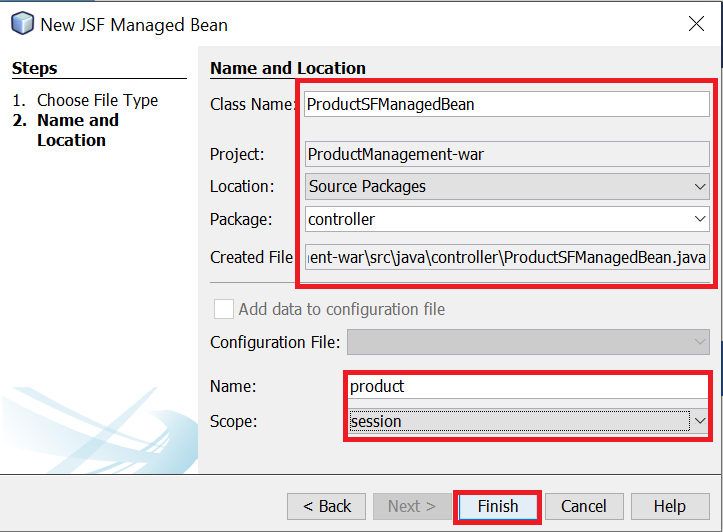 Tạo JSF Managed Bean: chuột phải vào ProductManagement-war -> New -> Orther... -> JavaServer Faces -> Next